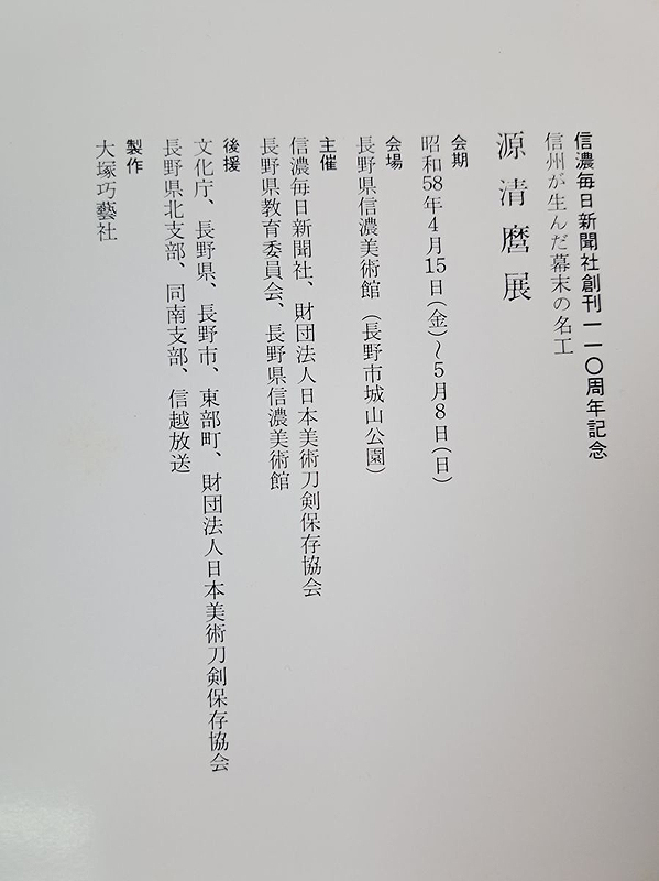 This exhibition catalog, titled "Minamoto Kiyomaro," published to commemorate the 110th anniversary of the Shinano Mainichi Shimbun, is an illustrated catalog (zuroku) of an exhibition held from April to May 1983 (Sh?wa 58). The exhibition was dedicated to the famous swordsmith of the late Edo period, Minamoto Kiyomaro, who hailed from Shinano Province (present-day Nagano Prefecture).